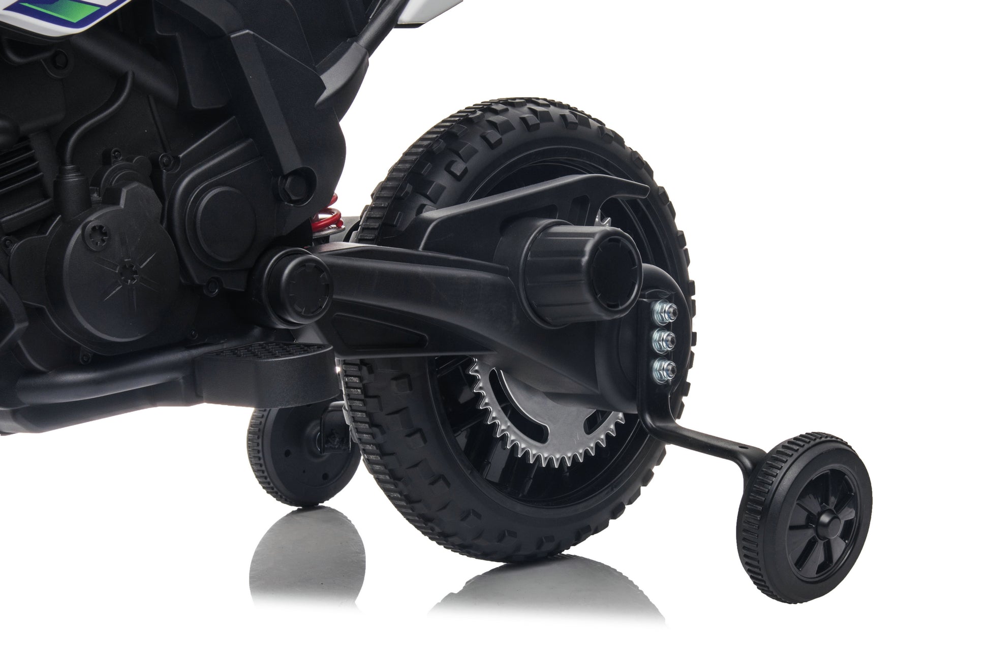 The licensed Aprilia RX125 kids motorcycle is the perfect ride for young adventurers who crave excitement and fun. With powerful 12v battery and dual-motor setup, this kids ride on motorcycle can reach speeds up to 5.5-6 km/hr. The one-key startup and right-hand forward push button make this kids electric motorcycle easy for children to accelerate and control their speed. And with two detachable training wheels, younger riders aged 3+ years old can get started on their journey without any worries. The 12v motorcycle for children is equipped with anti-skid pattern tires to assure it will move smoothly and make sure a safe playtime on various terrains. Solid PP cover and metal frame make the kids dirt bike a lasting delight with a maximum weight of 30kg. Featuring with built-in music, USB and Bluetooth function, this battery powered motorcycle for kids manages to bring more joy to kids.